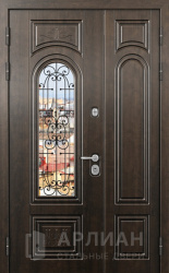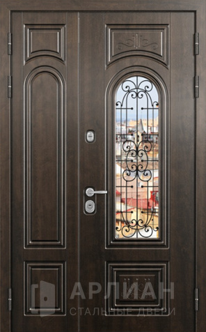 Элитная входная двустворчатая дверь массив дуба с ковкой и стеклом №24